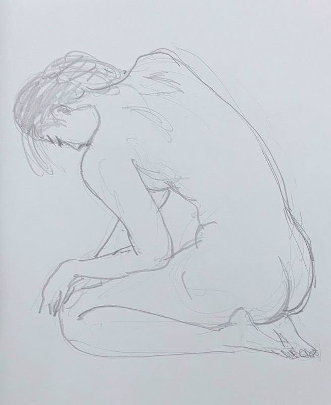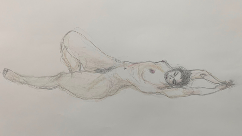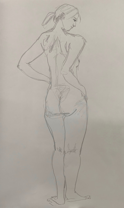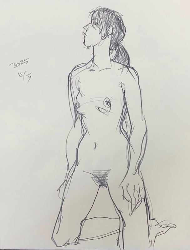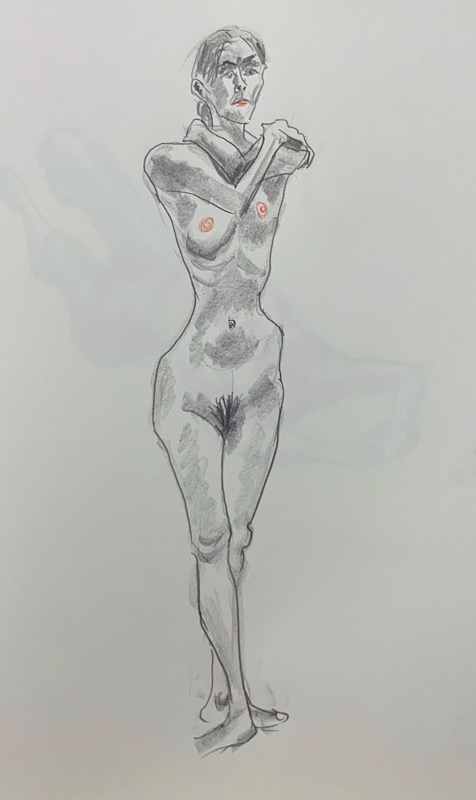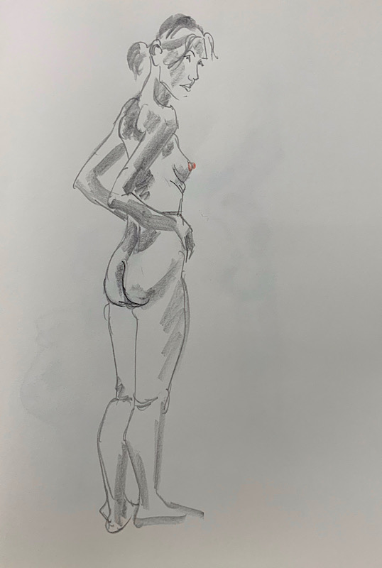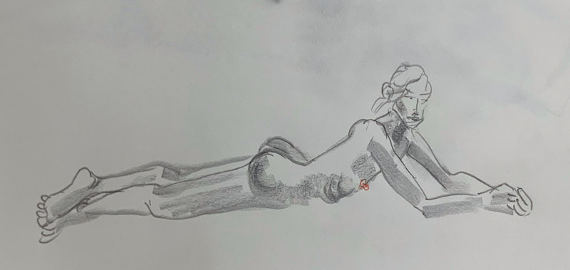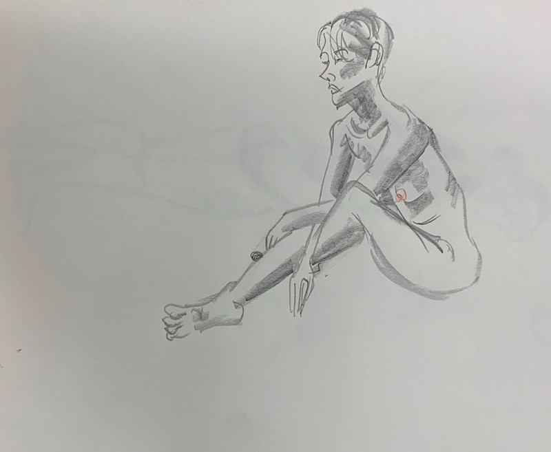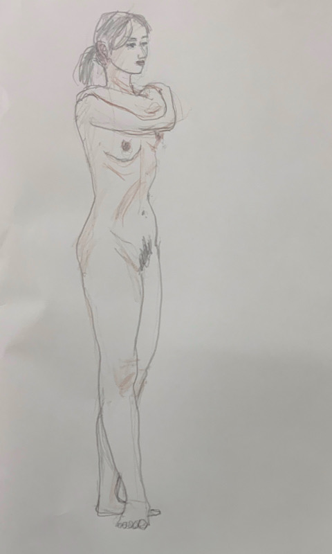 鍛え抜かれたボクサーのような身体を持つ今回のモデルさん。クロッキーでは、瞬間の美を切り取った力強いポーズの連続で、作家の皆様にひらめきを与えてくれました。視線は微動だにせず妖艶な魅力を放ち、ポーズをメモするプロ意識の高さも光る、まさに真のアーティストモデルです。