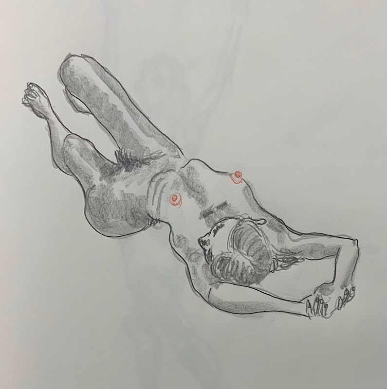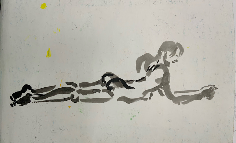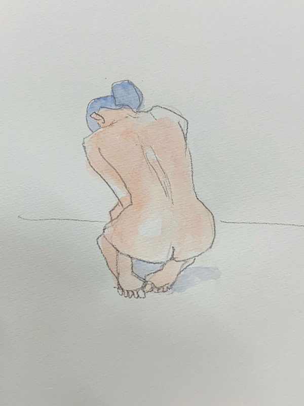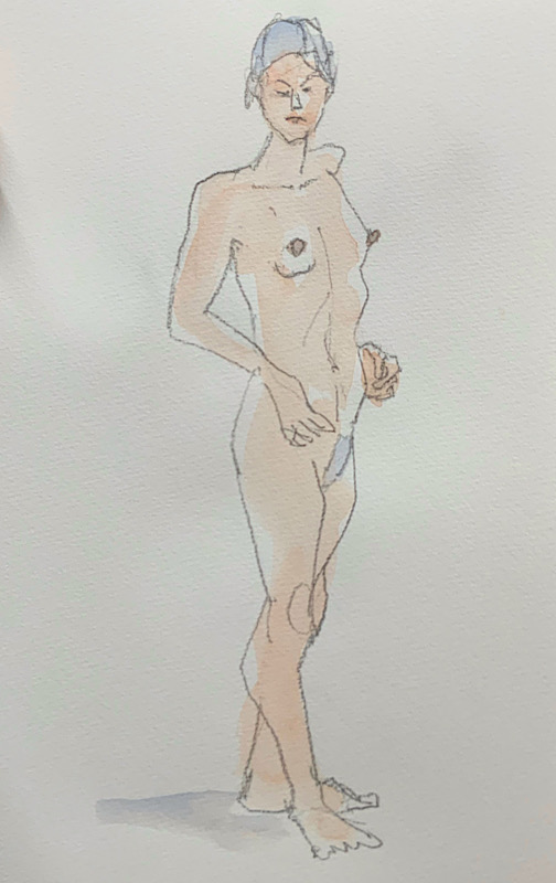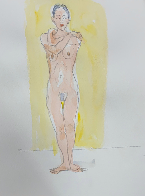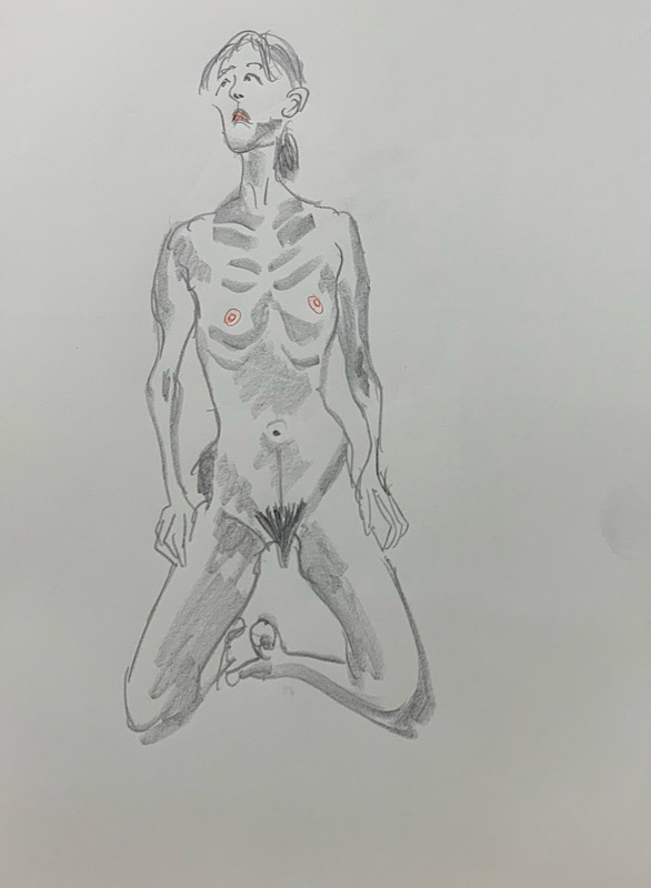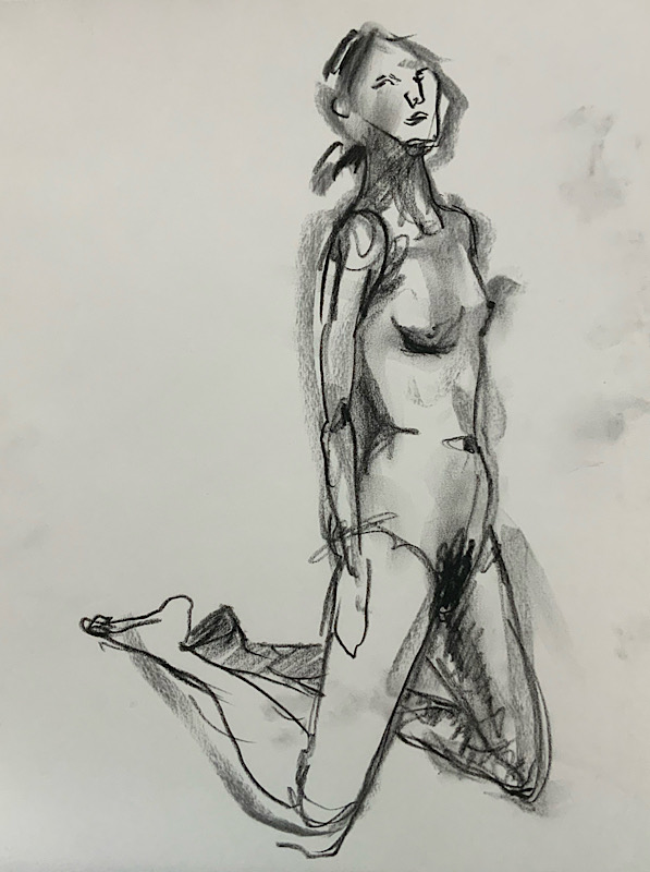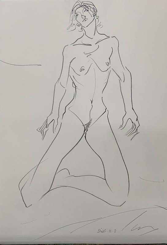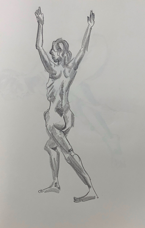 鍛え抜かれたボクサーのような身体を持つ今回のモデルさん。クロッキーでは、瞬間の美を切り取った力強いポーズの連続で、作家の皆様にひらめきを与えてくれました。視線は微動だにせず妖艶な魅力を放ち、ポーズをメモするプロ意識の高さも光る、まさに真のアーティストモデルです。