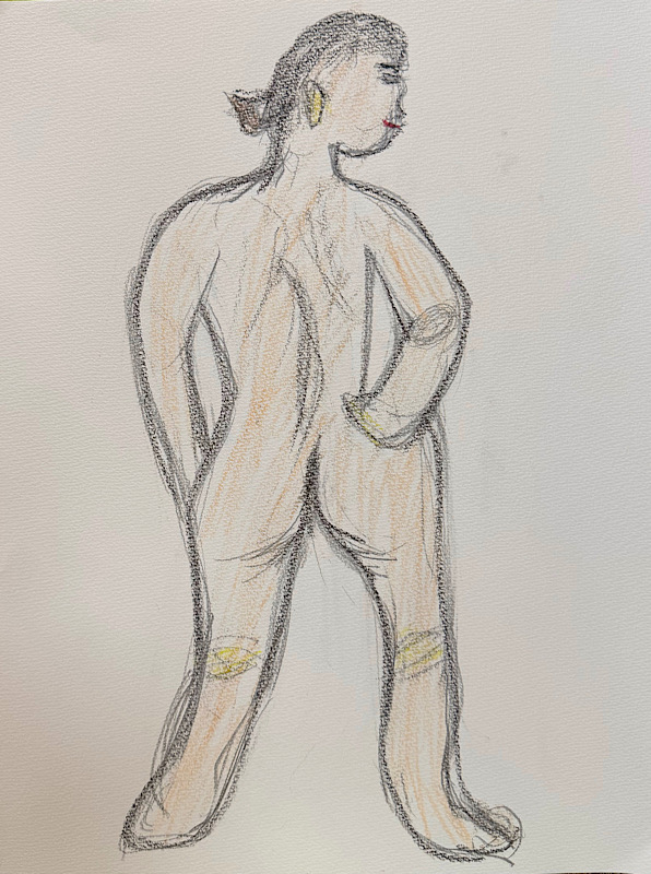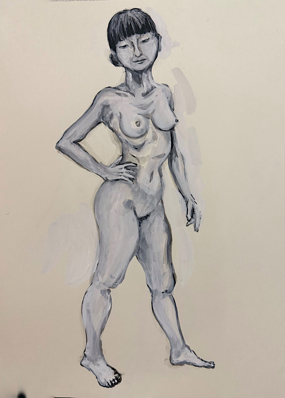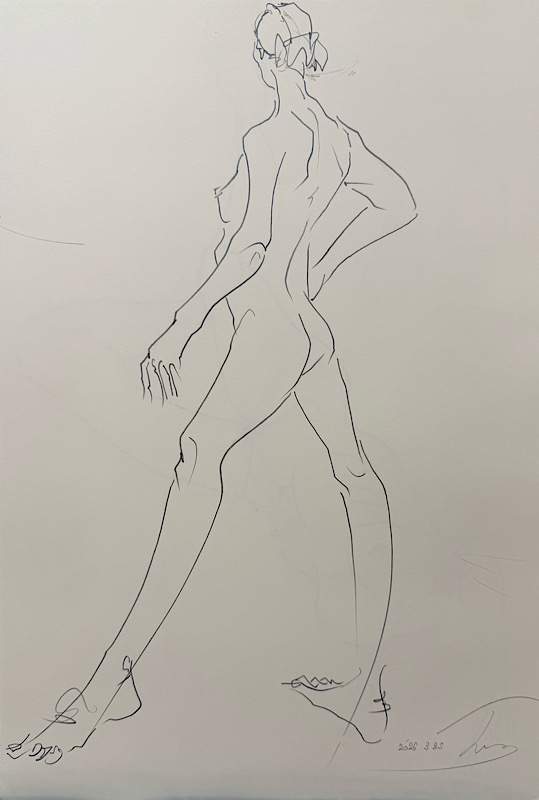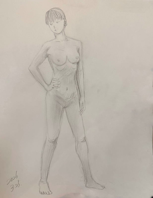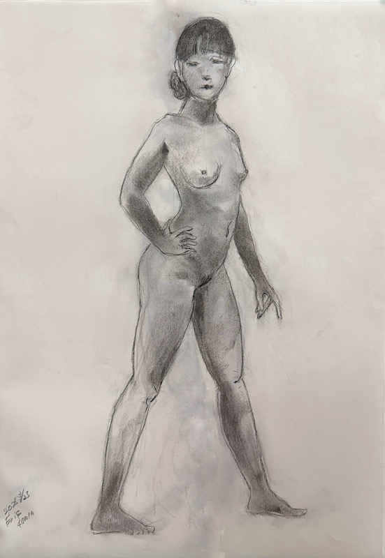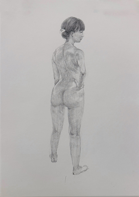 寂の中に溶け込む、彫刻のような不動のポージング。20分間×4回、一点を見据える強い眼差しと豊満な肢体は、生ける古典芸術の如き品格を放ちます。日本的な端正さと肉感的な造形が織りなす陰影は、画家の探究心を深く刺激し、画布に永遠を刻み込ませる圧倒的な力を秘めています。